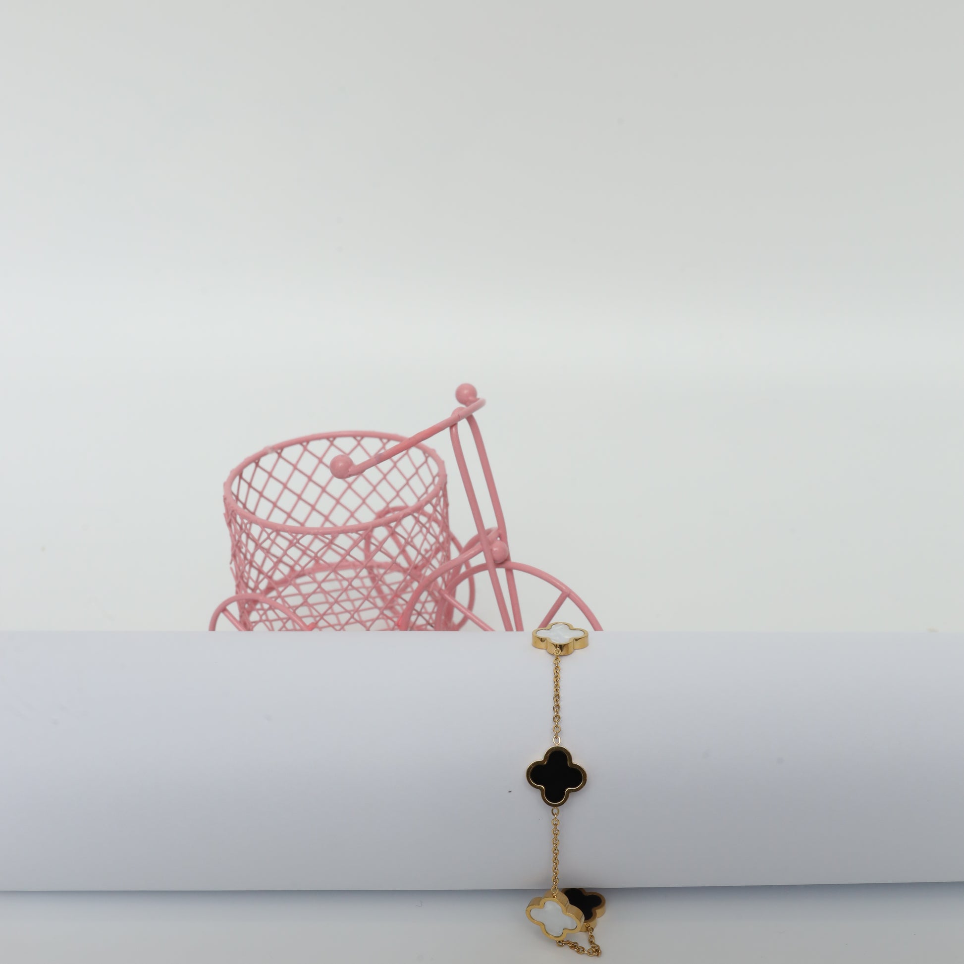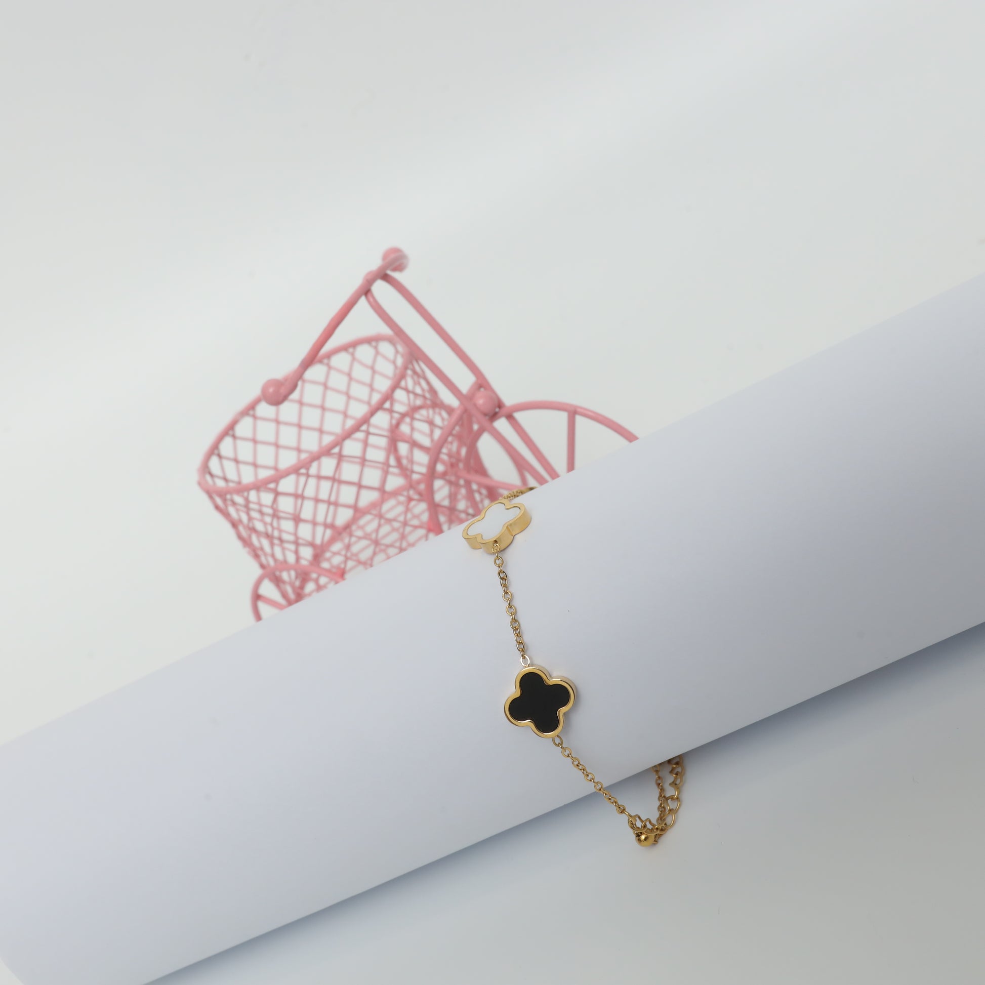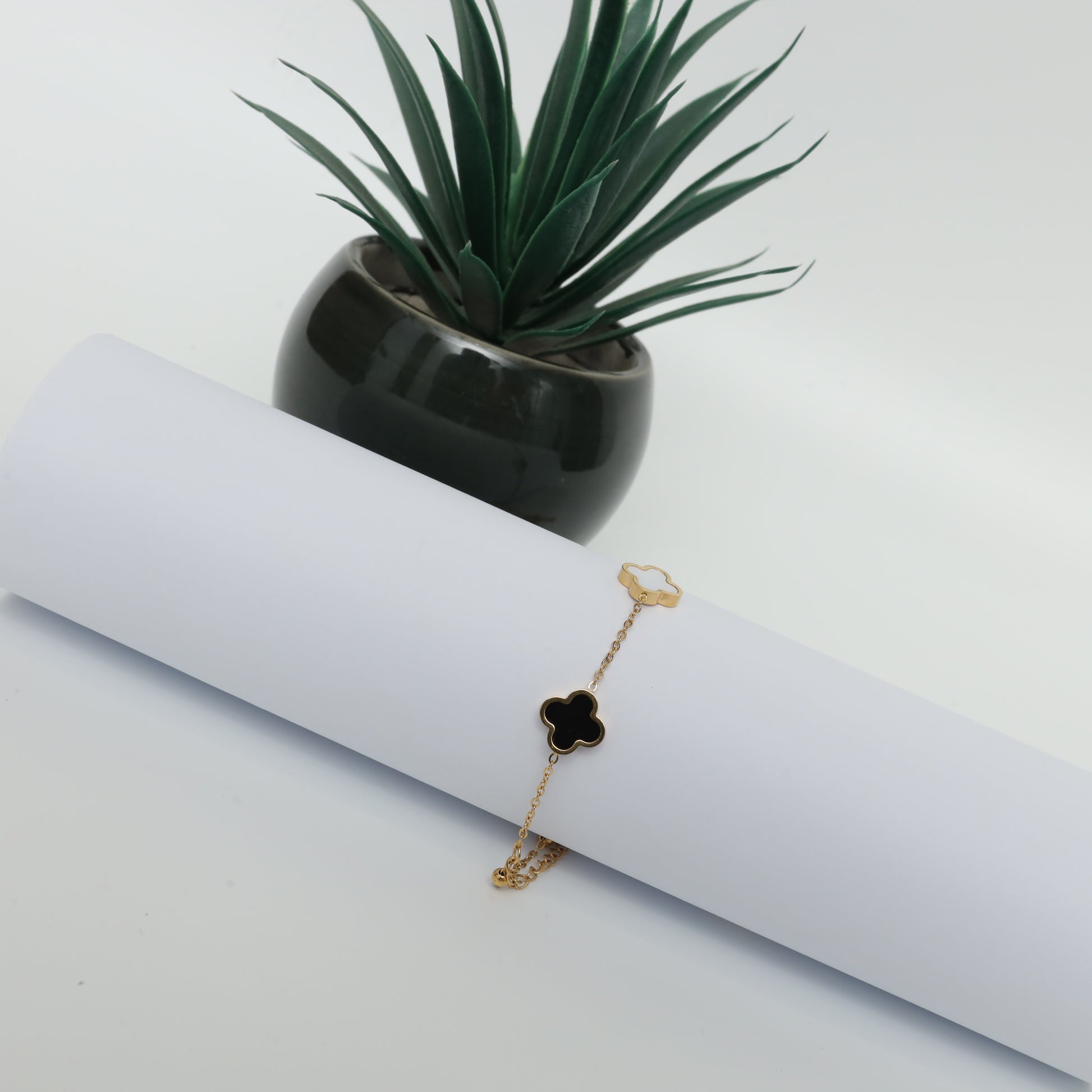 This charming gold-plated necklace features a delicate chain with multiple two-tone clover charms. The black and pearlescent white clovers are evenly spaced, creating a sophisticated and eye-catching design. This piece adds a touch of modern elegance to any outfit and can be worn alone or layered with other necklaces.