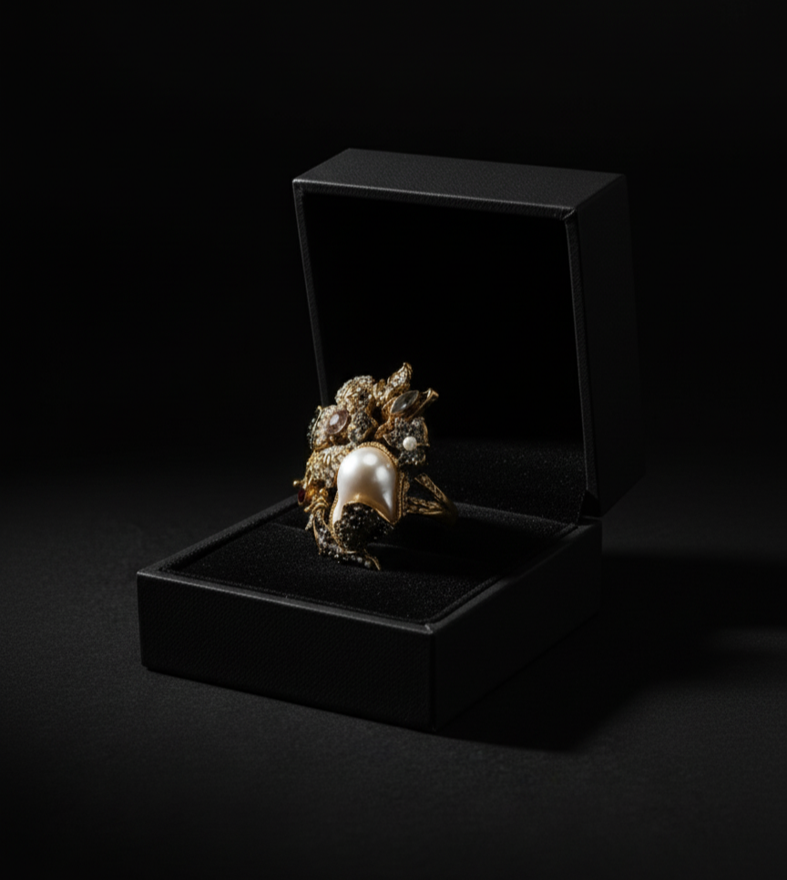 An ode to timeless opulence — the Celestial Empress Baroque Pearl & Gold Statement Ring dazzles with a sculpted baroque pearl, encased in intricate golden vines and embellished with shimmering crystals. This masterpiece evokes celestial beauty and royal grandeur, perfect for those who wear confidence as their crown.