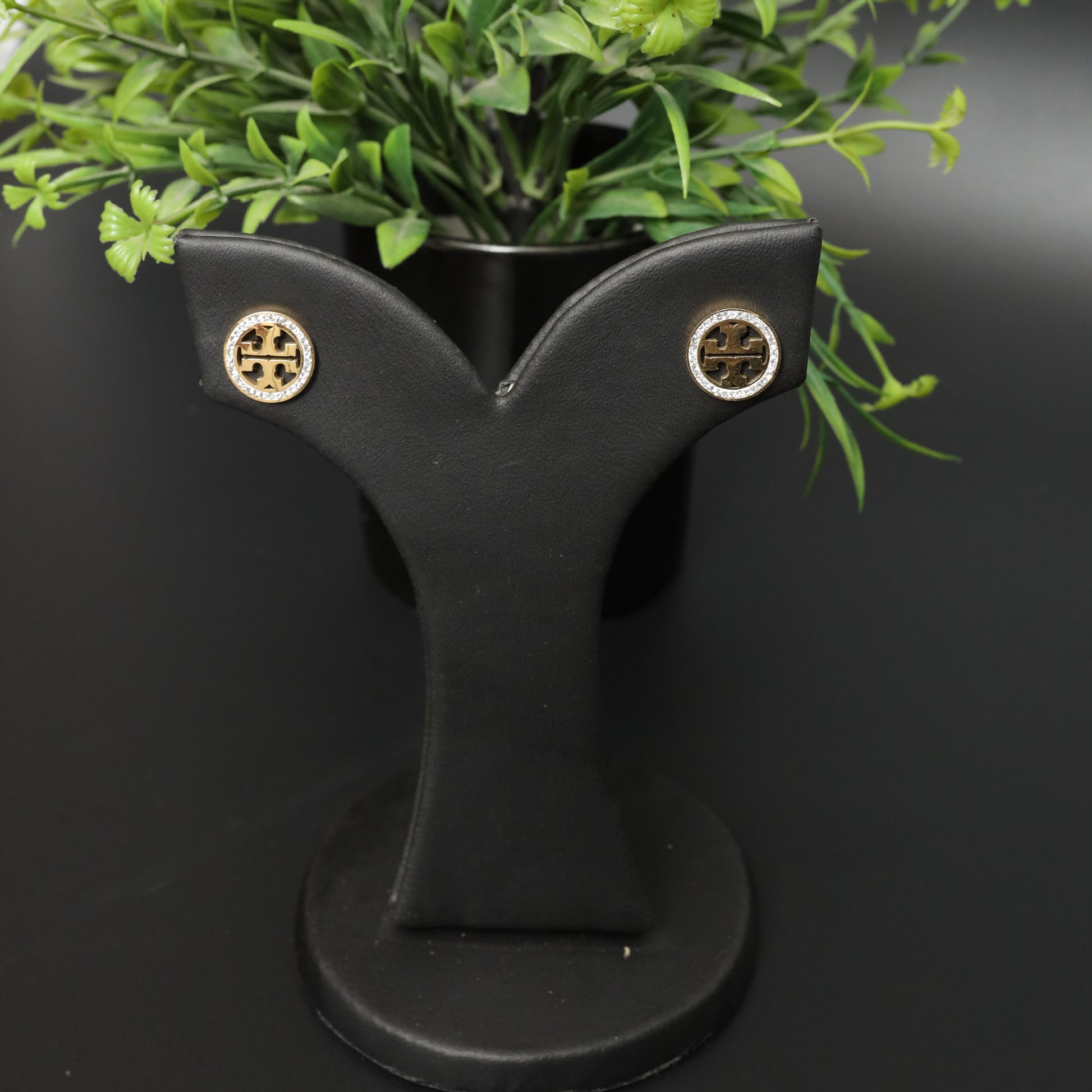 This single pair of gold-plated stud earrings features a classic circular design with a center logo detail. The outer rim is adorned with sparkling cubic zirconia stones, creating a brilliant and eye-catching effect. These earrings are a timeless and elegant accessory, perfect for adding a touch of sparkle to any outfit, from casual to formal.
