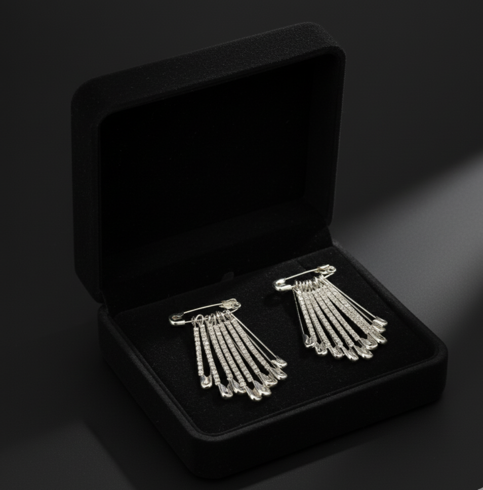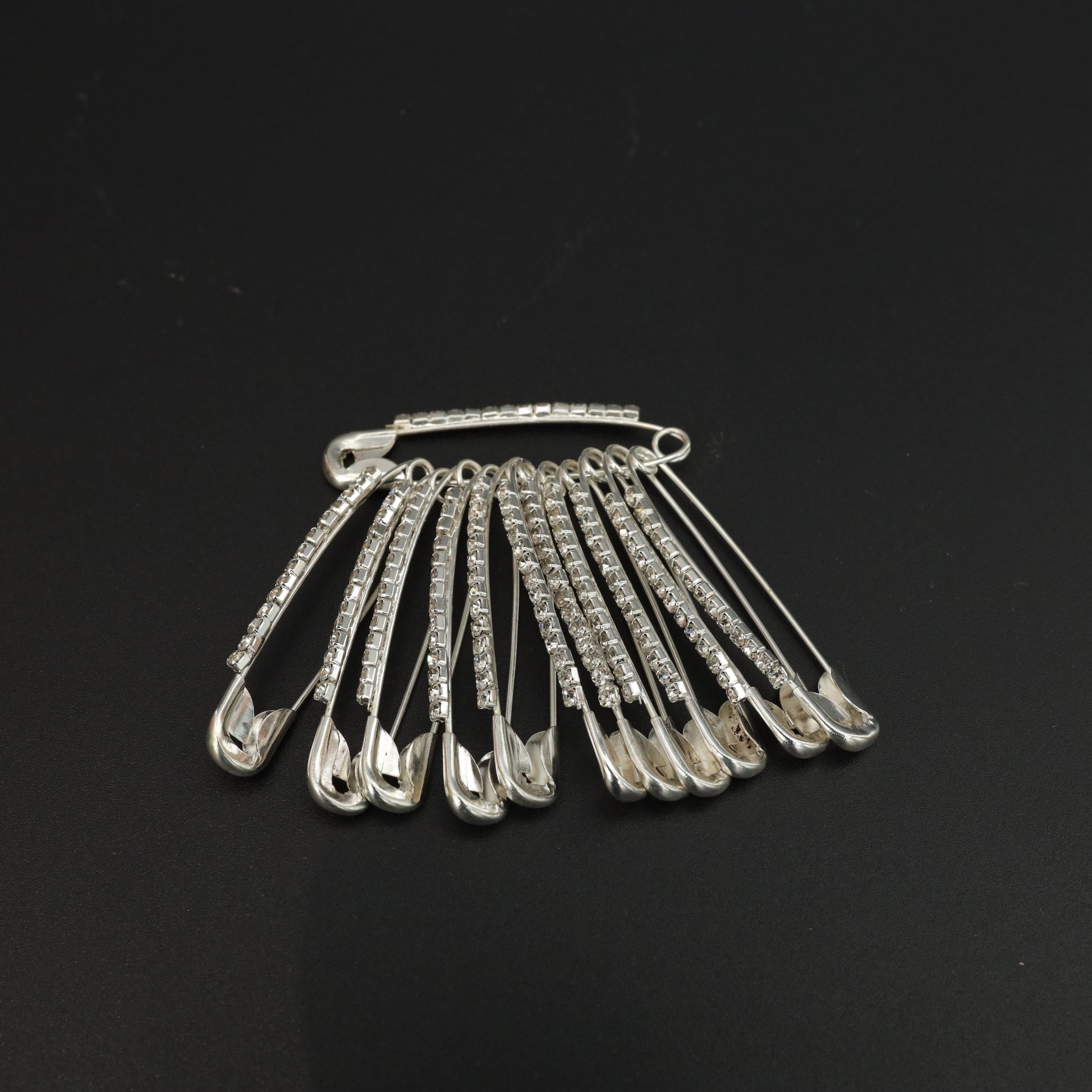 This unique set of rhinestone safety pins is a single pack of multiple pieces, offering a modern and edgy way to accessorize. Each pin is crafted from polished material and features a row of sparkling rhinestones, making them perfect for securing scarves, adding to a denim jacket, or creating a statement on clothing or bags.