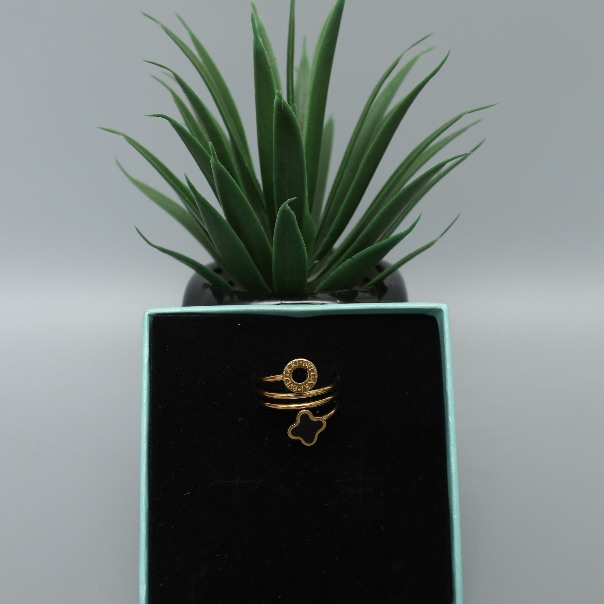 Gold Toned Spiral Ring with Clover and Logo Charms Stainless Steel