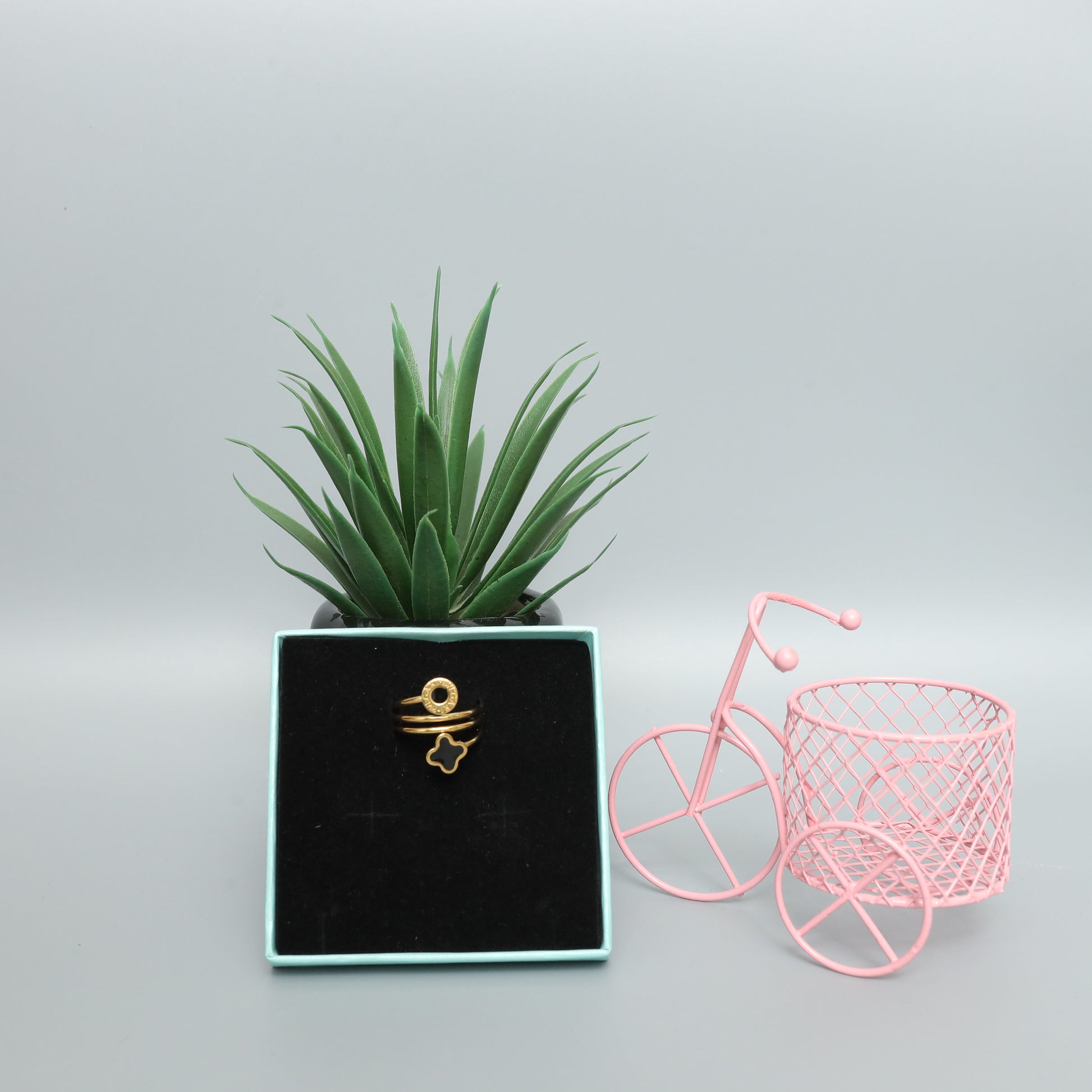 This playful and stylish Turkish design spiral ring is crafted in a bright gold tone and wraps elegantly around the finger. The open design features two delicate charms: a small, sparkling rhinestone-studded logo and a dangling four-leaf clover motif. This versatile piece combines sophistication with a touch of whimsy, making it a perfect everyday accessory for a modern, fashionable look.