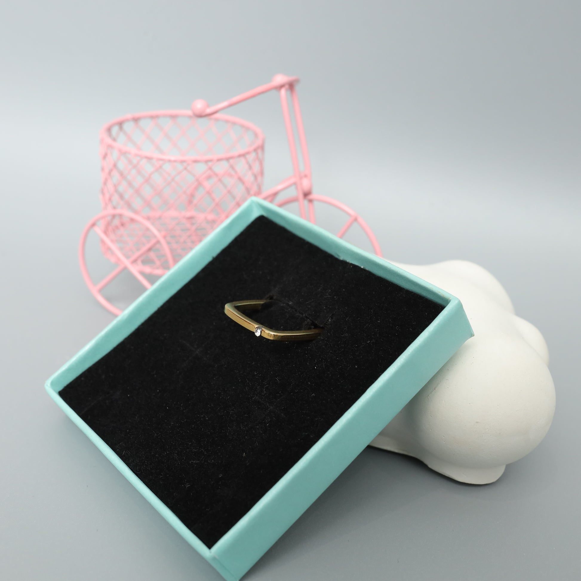 Gold Toned Square Band Ring with Single Rhinestone Accent - Geometric Minimalist Jewelry Stainless Steel