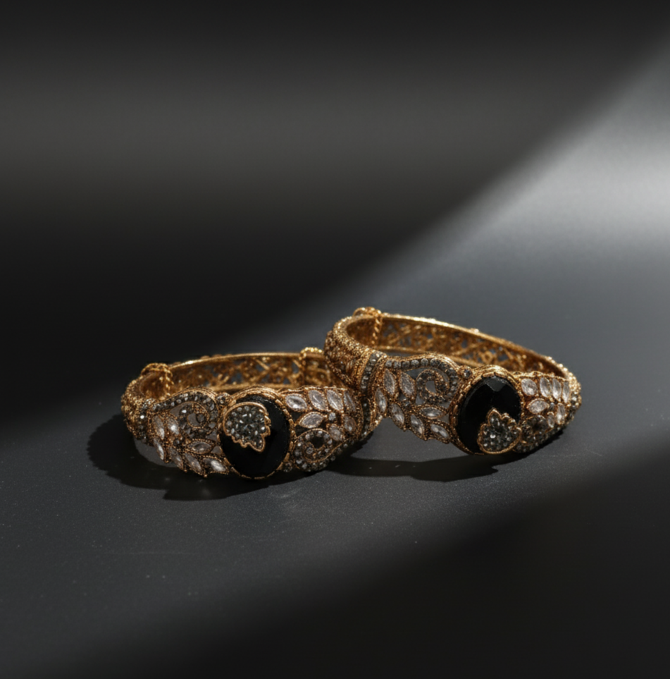 This striking Turkish design set is a pair of cuff bangles featuring bold black enamel centers, complemented by intricate metalwork. The gold-toned design is highlighted with brilliant rhinestones, creating a luxurious contrast that adds a sophisticated touch to any outfit. This elegant and versatile set is perfect for both formal events and adding a statement to your everyday style.