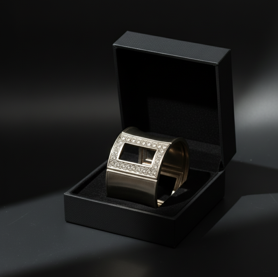 This bold and modern Turkish design cuff bangle features a wide, polished silver-toned band with a squared, open centerpiece. The central window design is brilliantly framed with two rows of sparkling rhinestones, creating a striking contrast against the smooth metal. The architectural shape and dazzling detail make this statement piece perfect for contemporary fashion and evening wear.