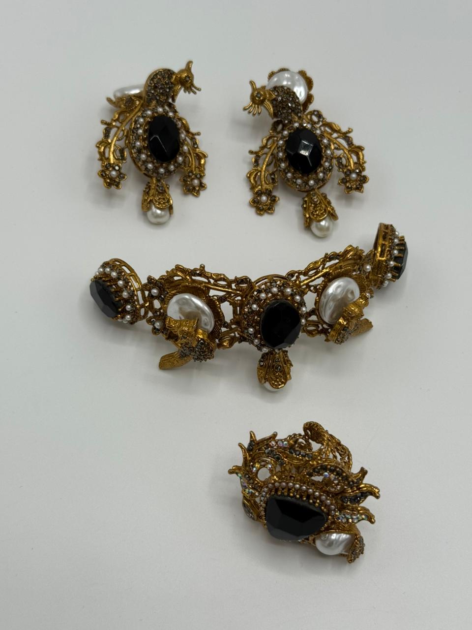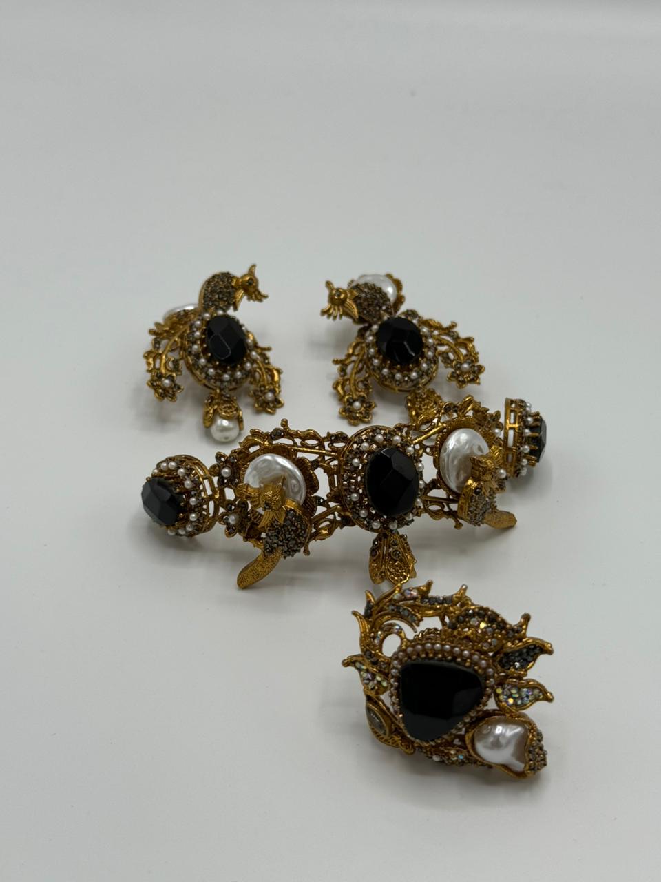 The Royal Noir Ensemble is where timeless grandeur meets dark allure. Crafted in antique gold and adorned with deep black stones, glimmering crystals, and lustrous pearls — this jewelry set exudes a queen’s poise and mystery. Perfect for evening galas, luxury weddings, or any moment that calls for pure elegance and power.