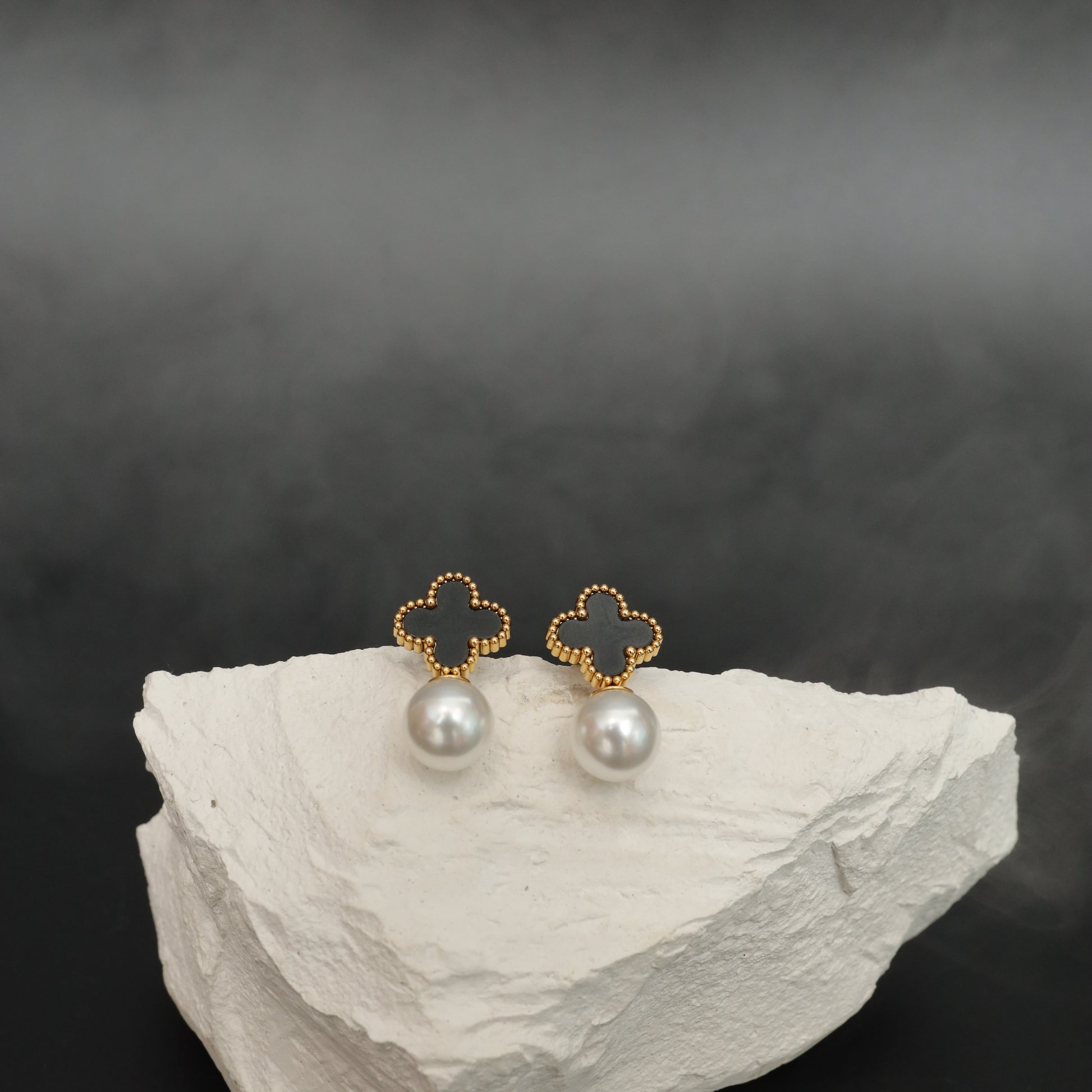 This elegant pair of drop earrings features a polished black clover design bordered with a beaded edge. A classic white pearl dangles from the bottom, creating a sophisticated and timeless look. The contrast between the black and gold tones makes these earrings a striking accessory, perfect for adding a touch of classic elegance to any outfit.