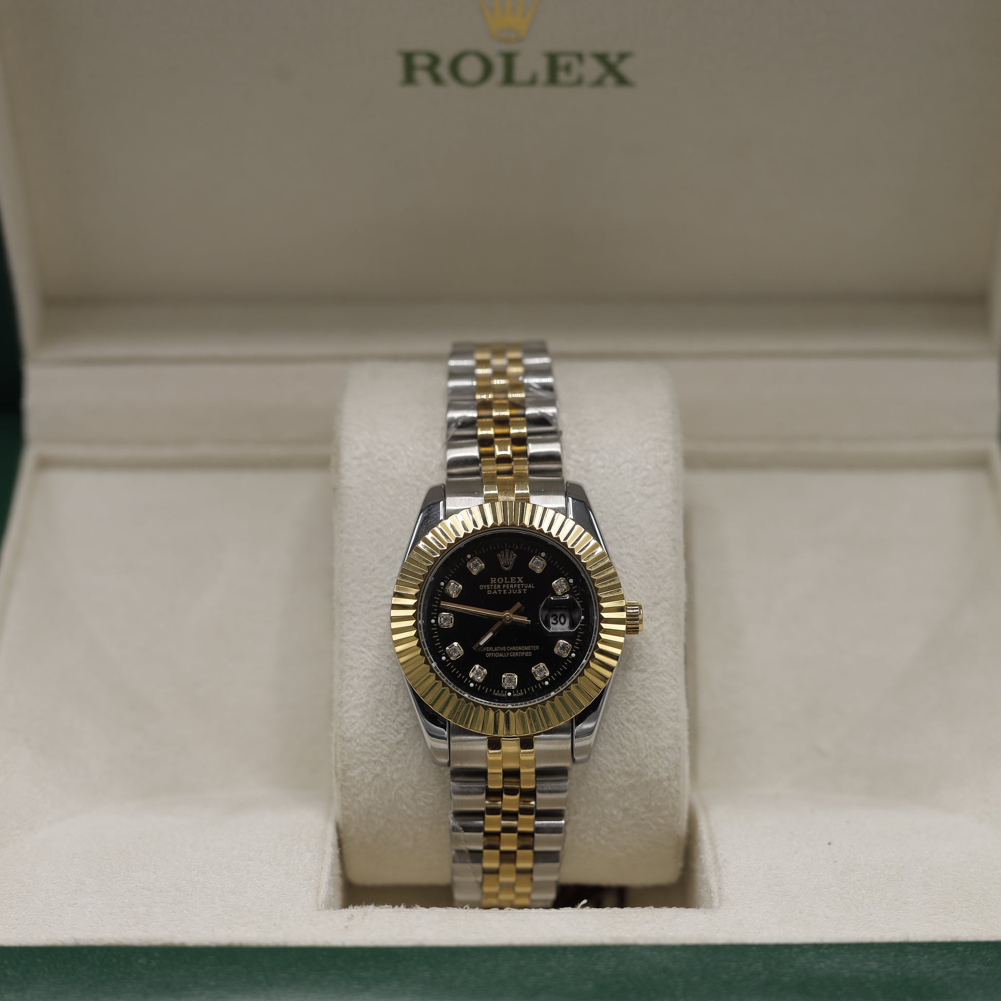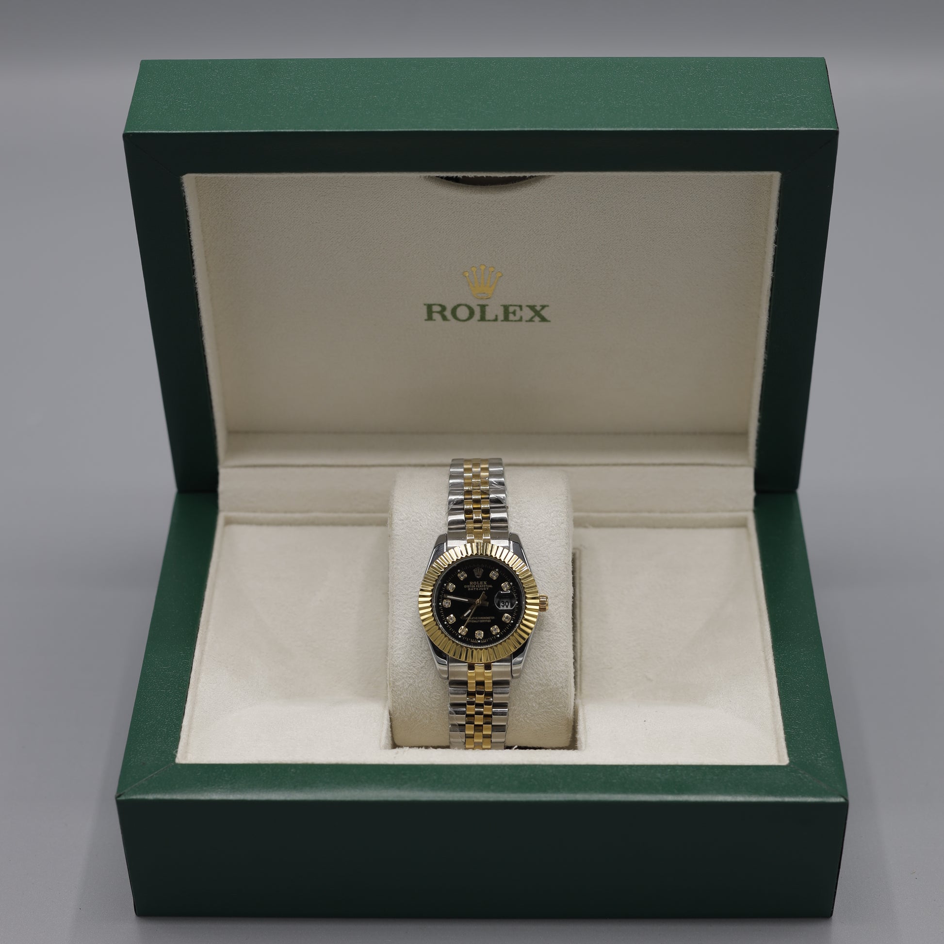 Elevate your style with this exquisite two-tone watch, featuring a striking black dial adorned with dazzling diamond hour markers. The classic fluted bezel in gold-tone complements the stainless steel and gold-tone Jubilee bracelet, creating a timeless and luxurious accessory perfect for any occasion. This watch combines elegant design with sophisticated craftsmanship, making it an ideal statement piece.
